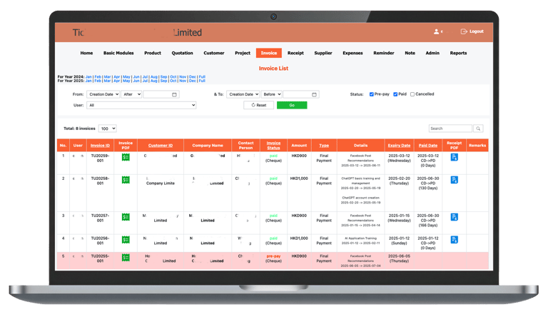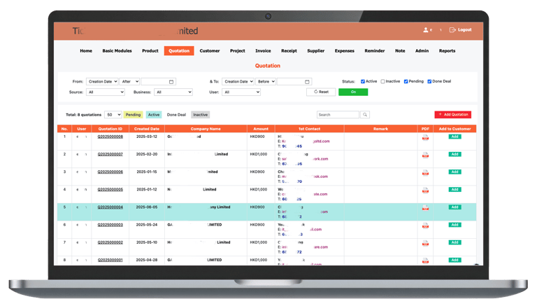 專為香港商務中心及服務型企業而設,我們的系統整合 報價、項目、發票、收款、提醒、客戶管理 等關鍵流程,讓日常營運更高效、更清晰、更少錯漏。