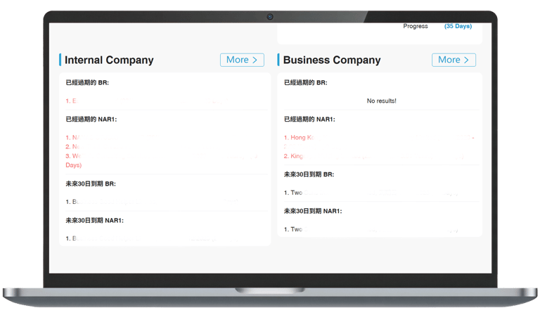 系統的核心優勢在於其智能的「文件過期提醒」功能。 它會自動追蹤每一份文件的到期日(如商業登記證續期),有效避免因文件過期或遺漏而導致的罰款與合規風險,為您的企業保駕護航。
