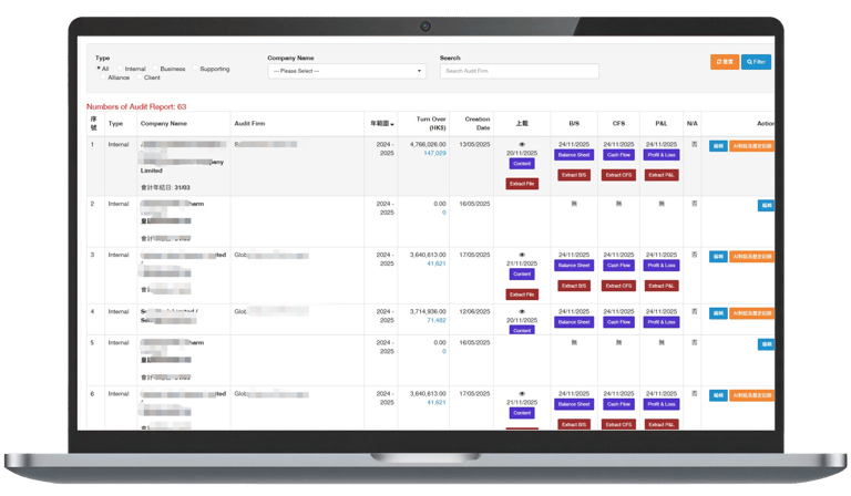 系統亦提供專門的審計報告列表,將所有公司的審計年份、審計師資料、營業額、報表下載連結統一呈現。使用者可: